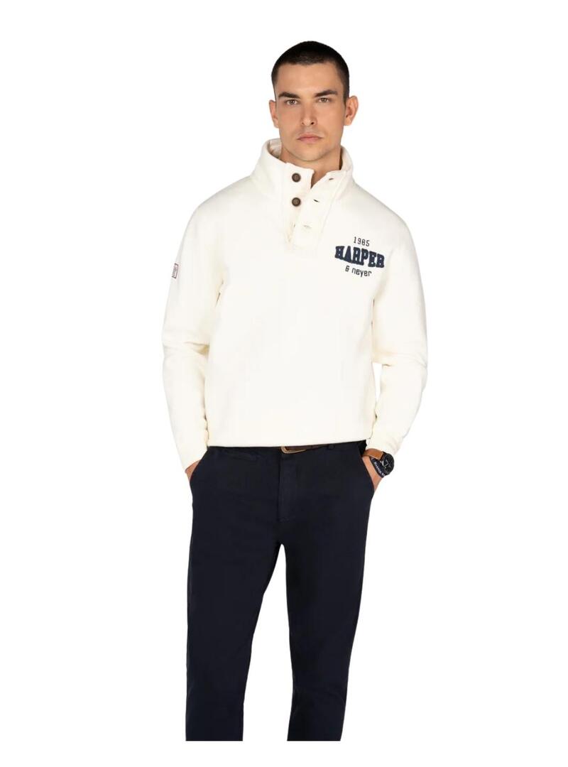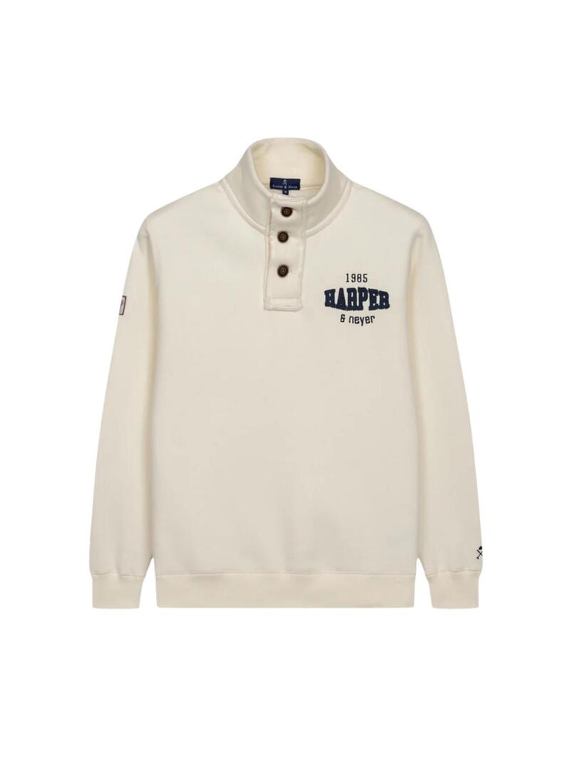 Sudadera de algodón estilo college con tapeta de botones y cuello subido. Corte regular fit y acabados en canalé en puños y bajo para un ajuste cómodo y estructurado. Destaca por su diseño con bordado frontal tipo varsity “Harper & Neyer 1985” y cierre de tres botones en contraste que refuerzan la estética universitaria. Detalle bordado en la manga. Perteneciente al universo Old School, esta sudadera representa el espíritu preppy de los campus americanos de élite. Combínala con chinos o vaqueros rectos y unas zapatillas blancas para un look informal con clase. También perfecta con camisa para elevar el conjunto.