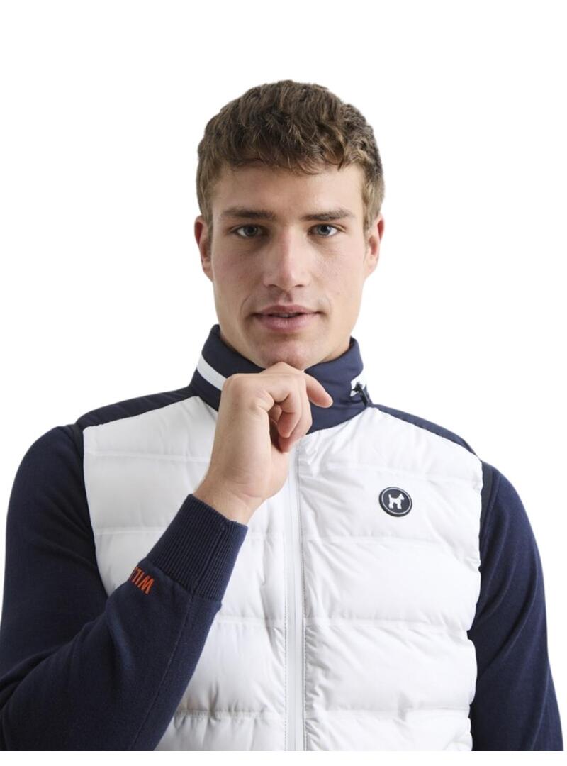 Chaleco Tecnico Hibrido. Este chaleco acolchado está diseñado para quienes buscan estilo y funcionalidad. Disponible en dos colores clásicos, blanco y marino, ofrece un diseño ultraligero ideal para cualquier temporada. Incluye una capucha invisible que se guarda fácilmente, perfecta para adaptarse a cualquier clima. Destaca por sus detalles: tiradores customizados, un print discreto en el bolsillo lateral, un parche bordado y un elegante detalle de bandera en la parte trasera del cuello.
