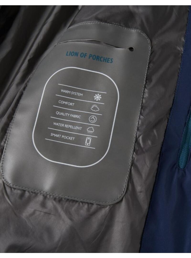 Chaqueta acolchada con capucha. Confeccionada en tejido técnico con función hidrófuga, lo que la convierte en la opción perfecta para protegerse del viento y la lluvia. Se cierra con una cremallera impermeable doble y tiene dos bolsillos delanteros con la misma cremallera. Está rematada con un emblema del Lion of Porches en la manga izquierda. También tiene bolsillos en el interior y un forro en color de contraste.